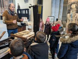 Poursuite du parcours artistique des CP au caveau des Jacobins avec la visite de l'atelier de La pierre qui encre.