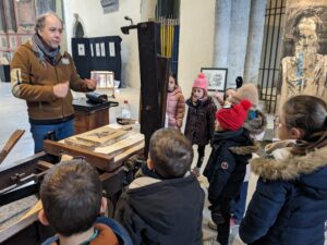Poursuite du parcours artistique des CP au caveau des Jacobins avec la visite de l’atelier de La pierre qui encre.